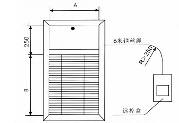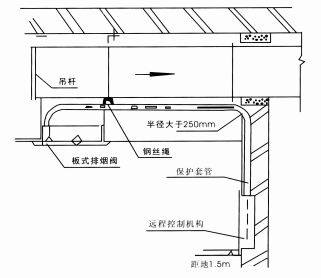 4、在排煙閥門(口)至遠程控制機構的相對位置輔好套管,套管的一端緊靠排煙閥(口),另一端緊靠遠程控制機構,然后將鋼纜繩穿入套管,將纜繩的一端穿進遠程控制機構并穿過導線軸繞在卷筒上,至少繞三圈、將多余的部分剪去。
